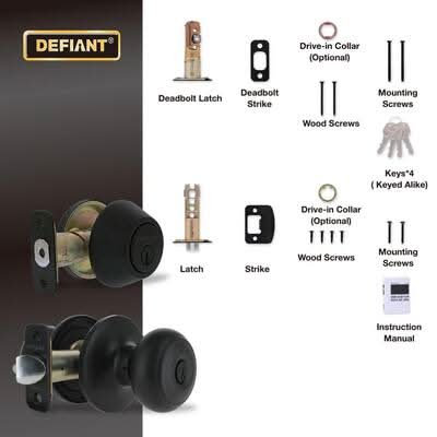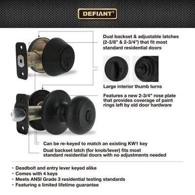 Featuring a Limited Lifetime Guarantee, Defiant offers this Hartford keyed entry knob and single cylinder deadbolt with proven durability and security. The new design features a 70 mm rose plate, providing easy coverage of previous paint marks in replacement applications. The design provides easy installation with only a Phillips screwdriver. The finish gives a clean look with a modern feel to your home. This door knob and deadbolt set is most WARNING: Cancer and Reproductive Harm - www.P65Warnings.ca.gov Color: Matte black