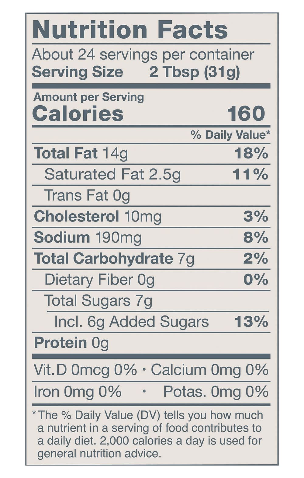 Ingredients: Soybean Oil, Sugar, BBQ Sauce [Tomato Paste, Corn Syrup, Vinegar, Natural Hickory Smoke Flavor, Caramel (Color), Spices, Garlic*, Onion*, Natural Flavor, Oleoresin Paprika], Water, Mustard (Distilled Vinegar, Water, Mustard Seed, Salt, Turmeric, Paprika, Spice, Garlic*), Distilled Vinegar, Egg Yolk, Salt, Cider Vinegar, Lemon Juice Concentrate, Mustard Flour, Xanthan Gum, Natural Flavor, Garlic*, Calcium Disodium EDTA Added to Protect Flavor, * Dehydrated Contains: Eggs Soybeans Tree Nuts