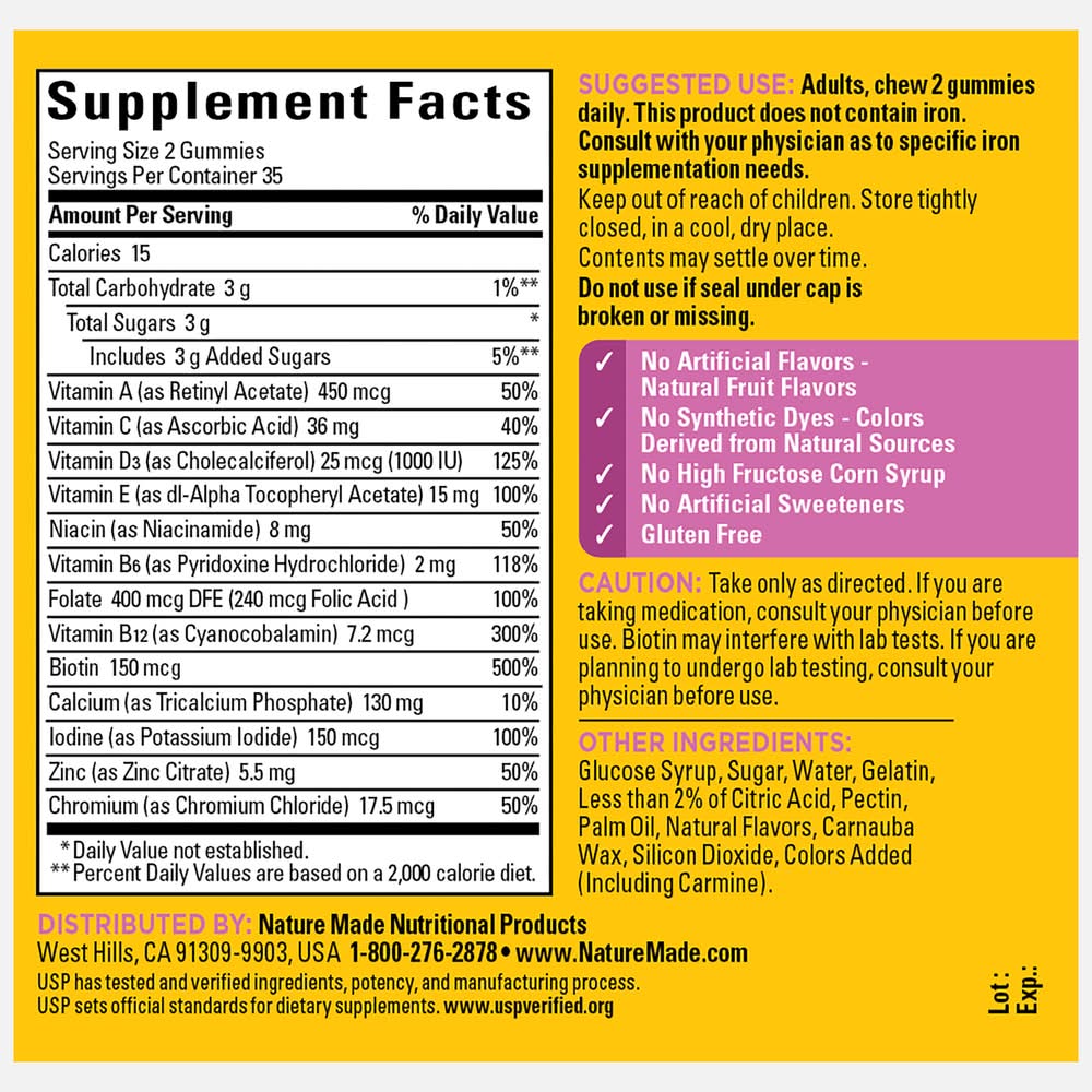 Ingredients: Vitamin A (as Retinyl Acetate), Vitamin C (as Ascorbic Acid), Vitamin D3 (as Cholecalciferol), Vitamin E (as dl-Alpha Tocopheryl Acetate), Niacin (as Niacinamide), Vitamin B6 (as Pyridoxine Hydrochloride), Folate, Vitamin B12 (as Cyanocobalamin), Biotin, Calcium (as Tricalcium Phosphate), Iodine (as Potassium Iodide), Zinc (as Zinc Citrate), Chromium (as Chromium Chloride), Glucose Syrup, Sugar, Water, Gelatin, Citric Acid, Pectin, Palm Oil, Natural Flavors, Carnauba Wax, Color Added (Carmine), Silicon Dioxide. Contains: Does Not Contain Any of the 8 Major Allergens