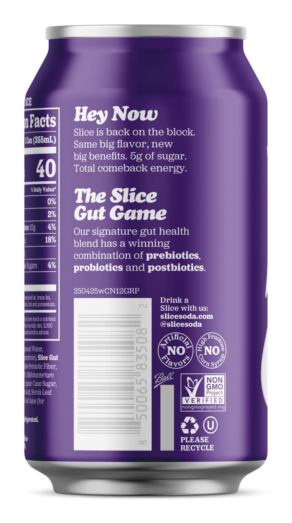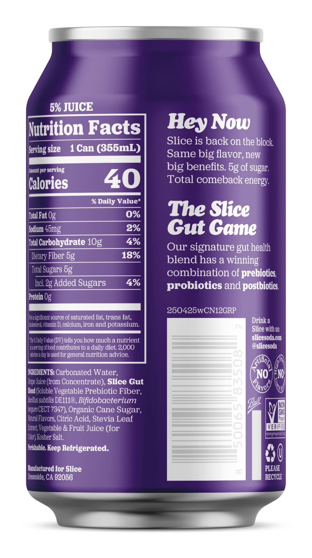 Slice is the spunky, full-flavored grape soda you loved as a kid, but now with grown-up benefits. This healthy soda contains probiotics, postbiotics and 5 grams of prebiotic fiber to support your digestive health. Established in 1984 and healthy since 2025, this prebiotic soda has the highest carbonation and is full of bubbles with only 5 grams of sugar per 12 oz can. Slice Grape Soda is perfectly sweet, ultra-bubbly and delivers a craveable splash of refreshing grape for an undeniably classic soda taste and experience. Naturally sweetened with real fruit juice, organic stevia and organic cane sugar, this carbonated fruit soda contains no high fructose corn syrup, artificial sweeteners or artificial flavors. Plus, it’s Non-GMO Project Verified and gluten free. Store this canned soda in the fridge to preserve the gut health benefits, so it’s ready to pop open and enjoy any time. All Slice soft drinks contain pre and probiotics for digestive health. Now you can have your soda and drink it, too. Flavor: Grape