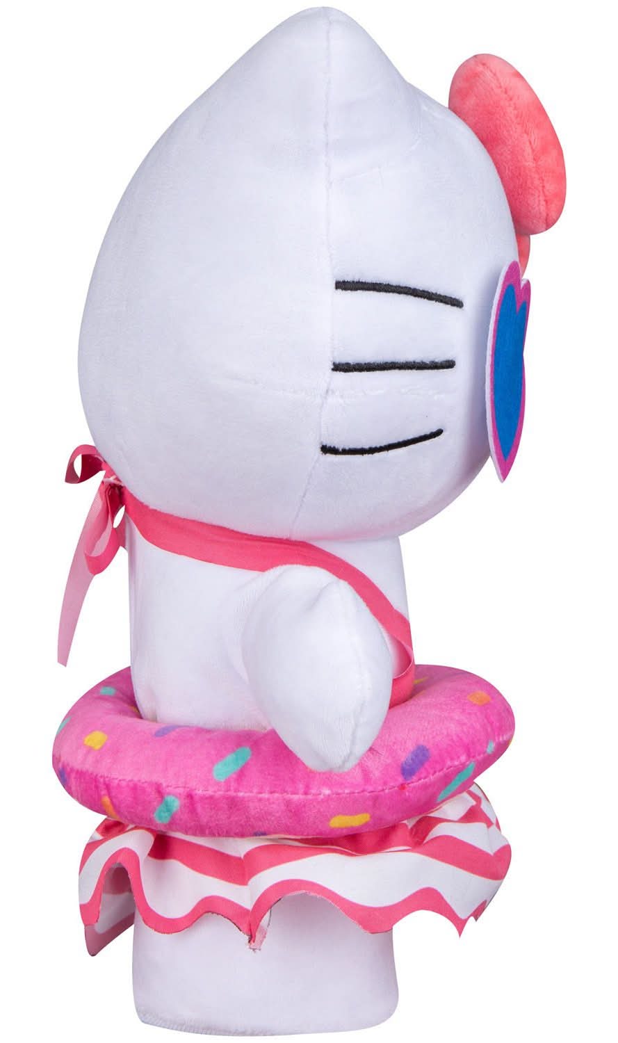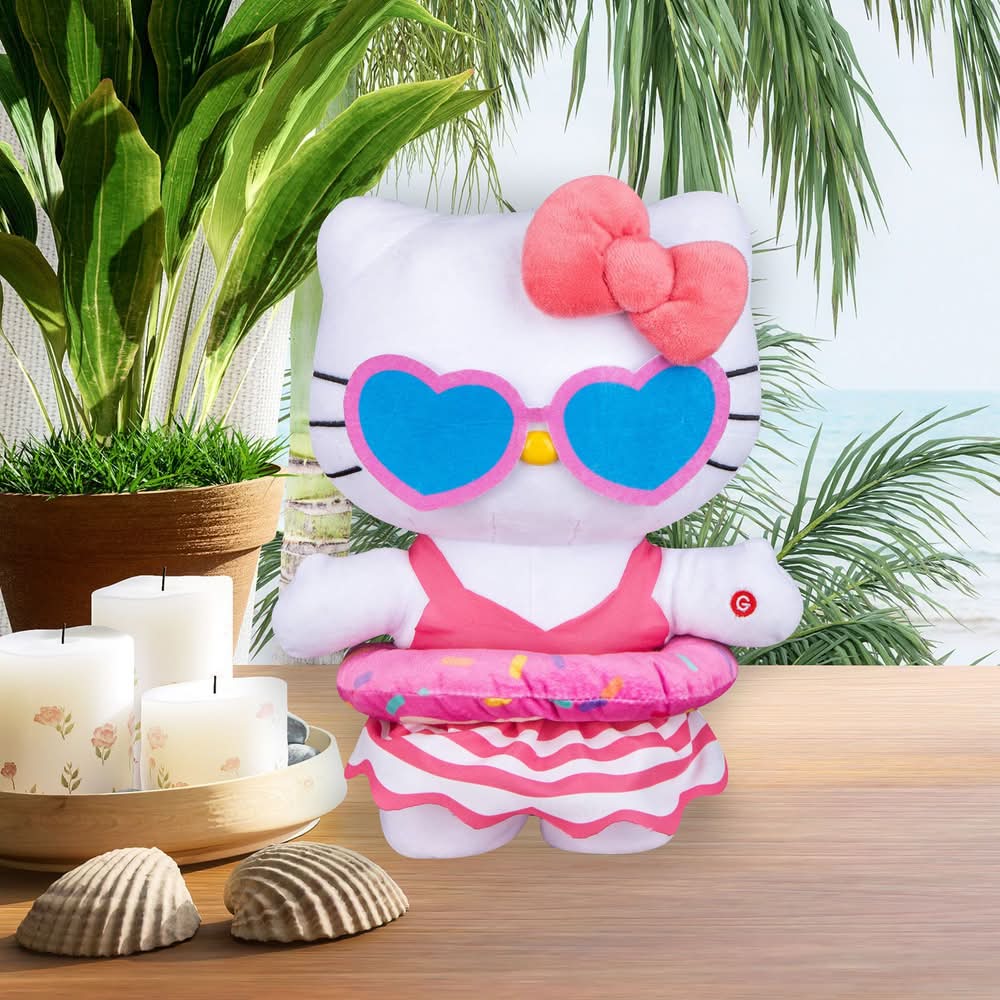 Get the beach party started with this animated Hello Kitty! Our musical plush wears an adorable two-tone pink dress with a pink hair bow. At the touch of a button, she steps to the beat of a fun instrumental song. Accented with a pink floatie and heart-shaped sunglasses, this adorable Hello Kitty is made with cozy plush fabrics. Delight fans with the perfect Hello Kitty summertime gift. Dances and steps to a fun instrumental song Requires 3 AA batteries (not included) Push-button activation For indoor use Ages 3+