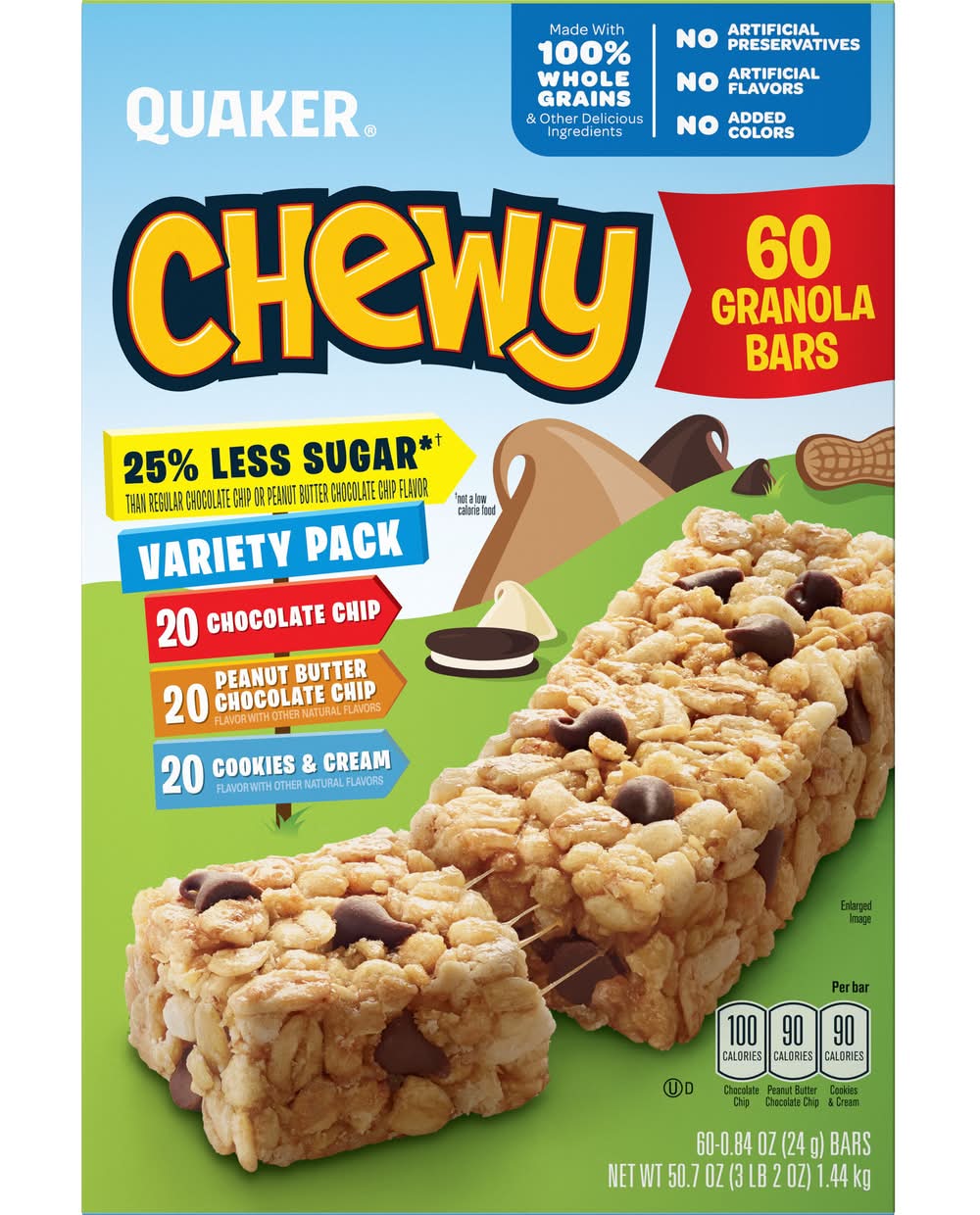 Quaker Chewy Granola Bars Variety pack, Chocolate Chip-Peanut Butter Chocolate Chip-Cookies & Cream (60 x 50.7 oz)