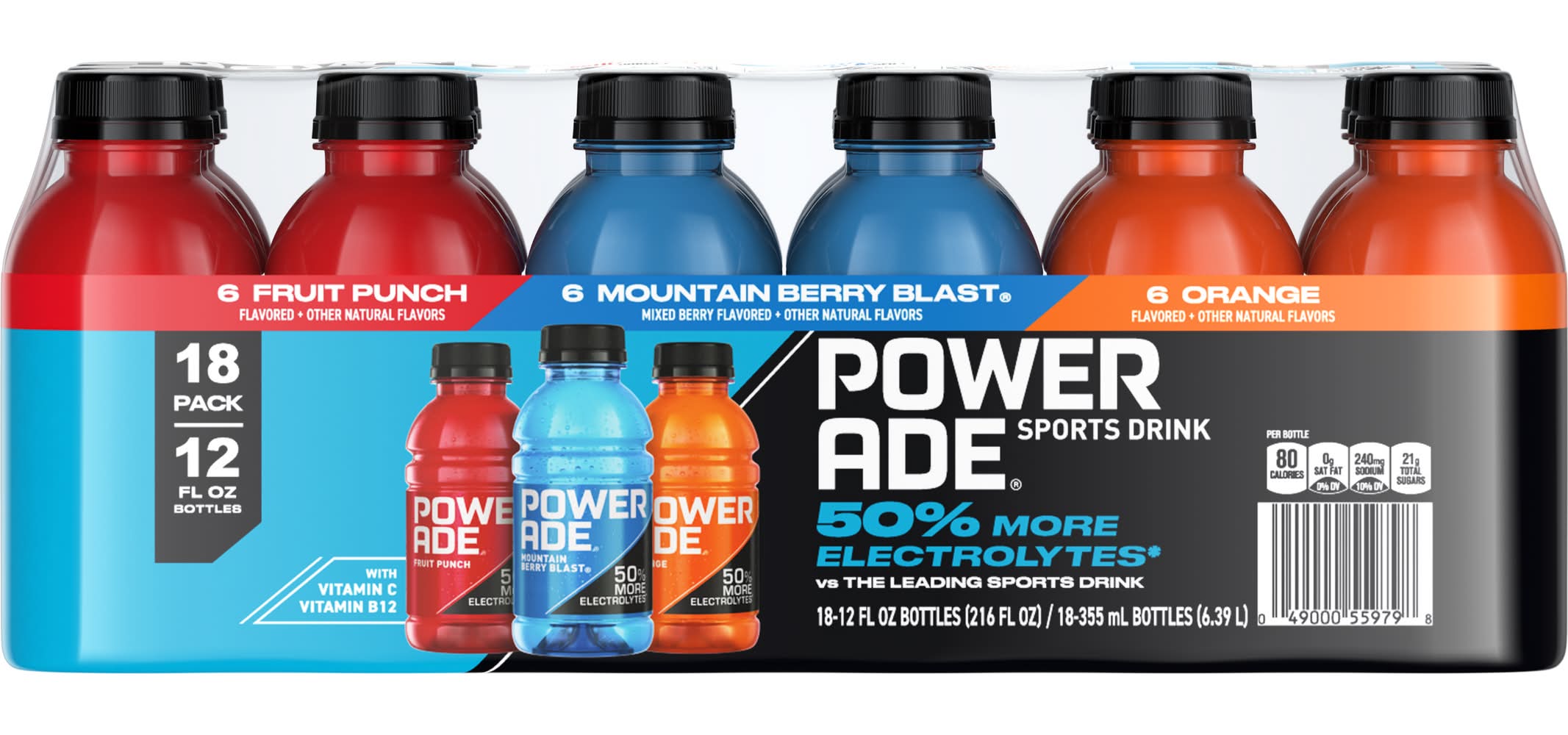 Powerade Electrolyte Enhanced Sports Drink, Fruit Punch Mountain Berry Blast Orange (18 x 12 fl oz)