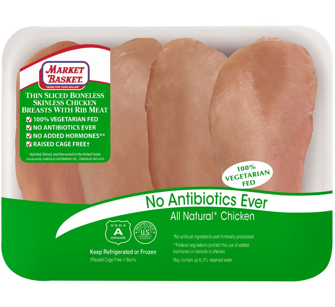 Market Basket Uncooked, Thin Sliced, Boneless, Skinless Chicken Breasts With Rib Meat (12 lbs)