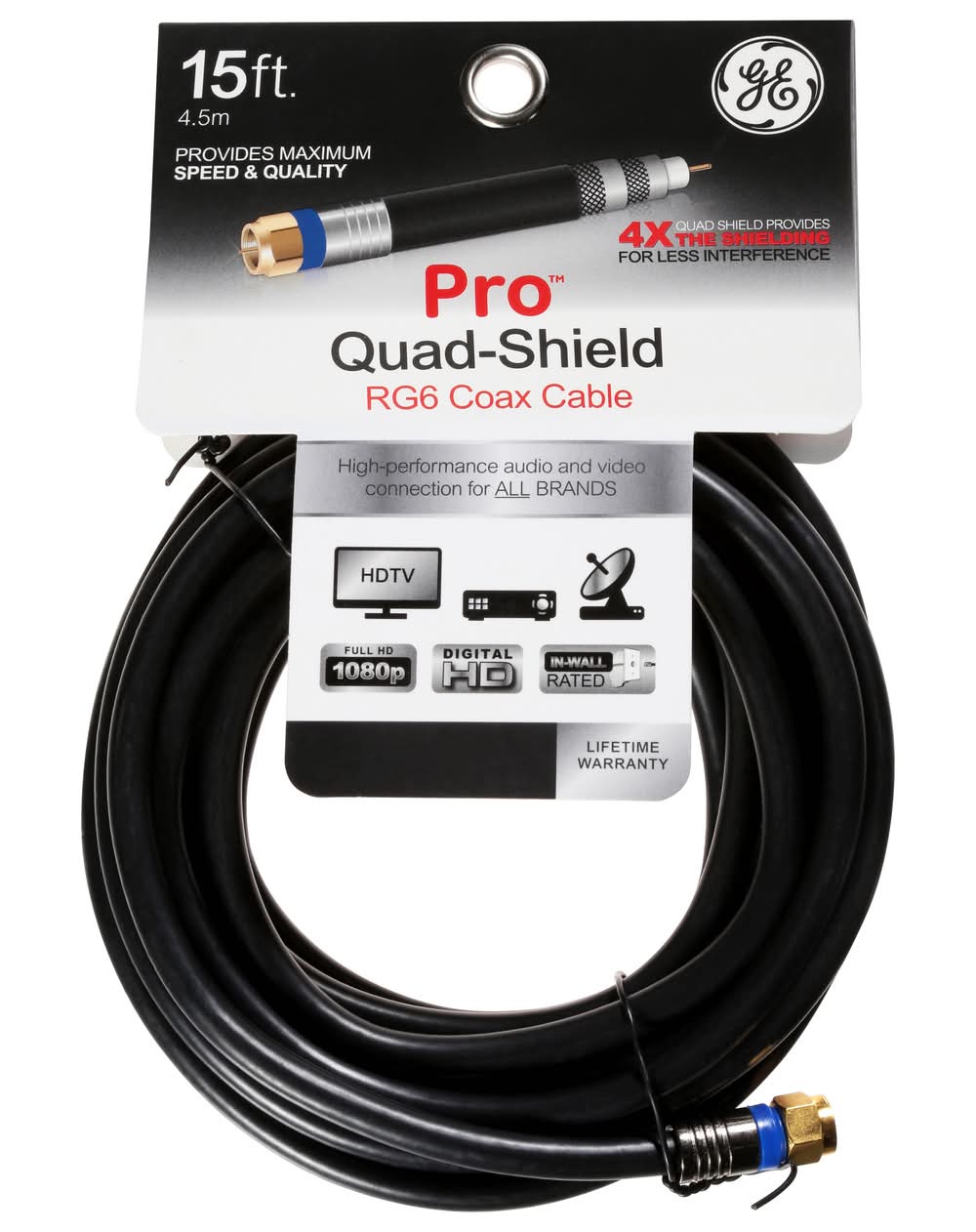 General Electric Pro Quad Shield Rg6 Coax Cable, 15 ft, Black