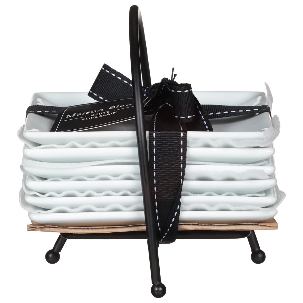 Maison Blanc Set Of Six White Porcelain Appetizer Plates in Metal Rack