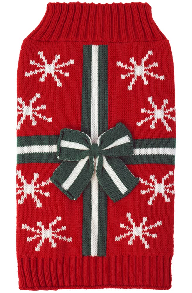 Fetch Your Own Adventure Snowflake Bow Holiday Dog Sweater, L, Red