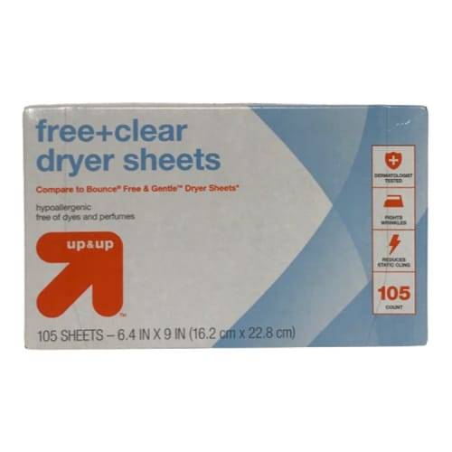 up&up Free and Clear Fabric Softener Dryer Sheets, 6.4x9 in (105 ct)