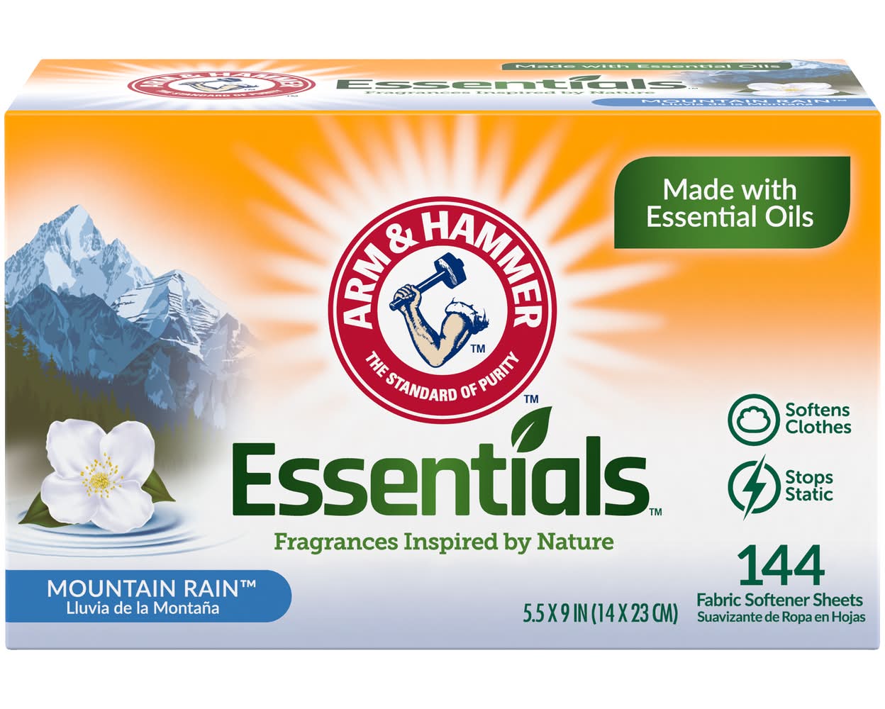 Arm & Hammer Essentials Fabric Softener Sheets Mountain Rain, 5.5 In X 9 In (144 ct)
