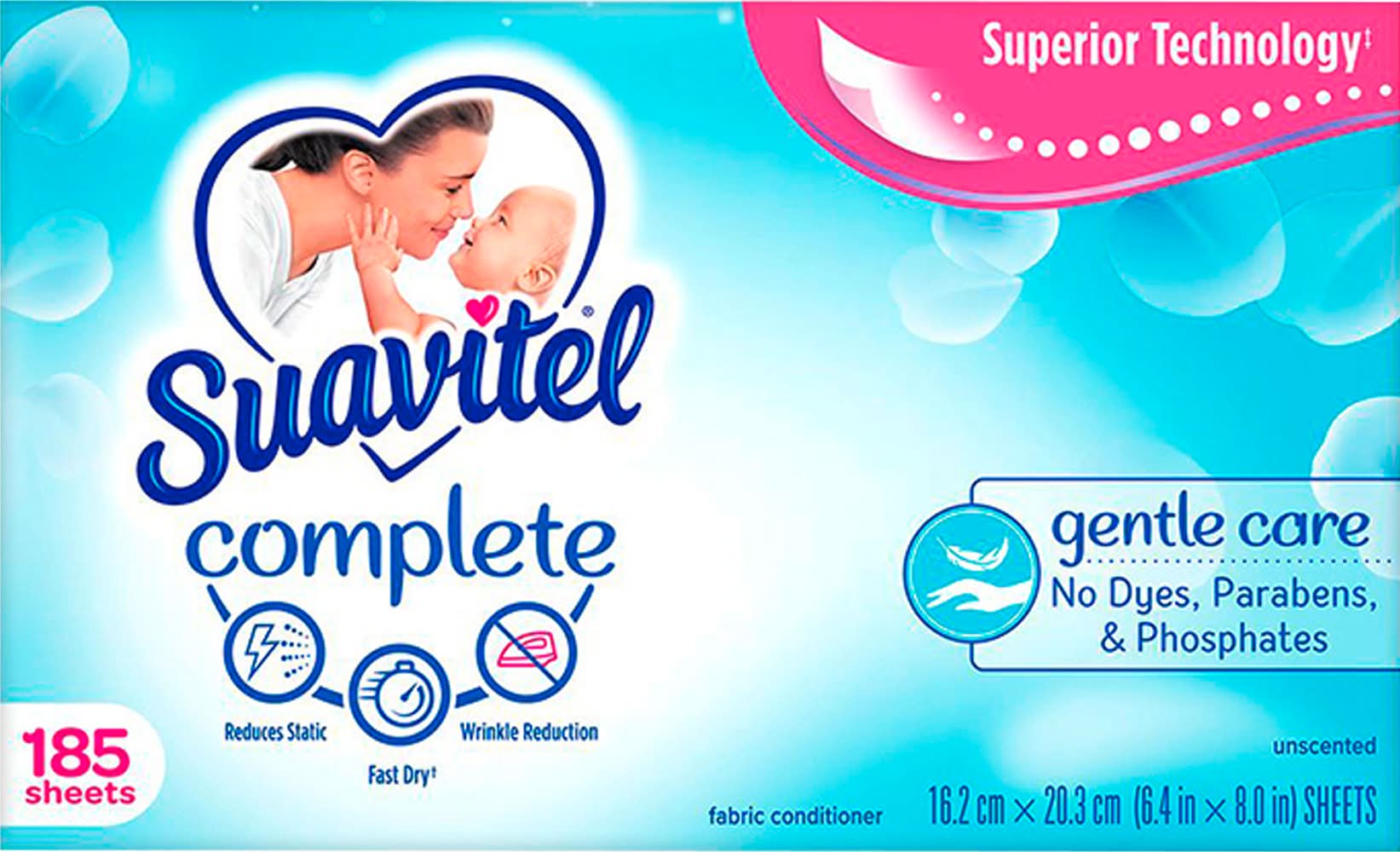 Suavitel Complete Gentle Care Unscented Fabric Conditioner Sheets, 6.4 Inches*8 Inches (185 ct)
