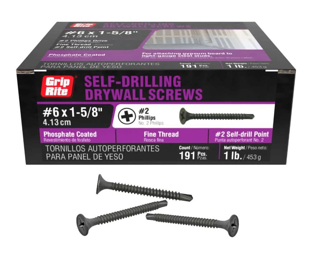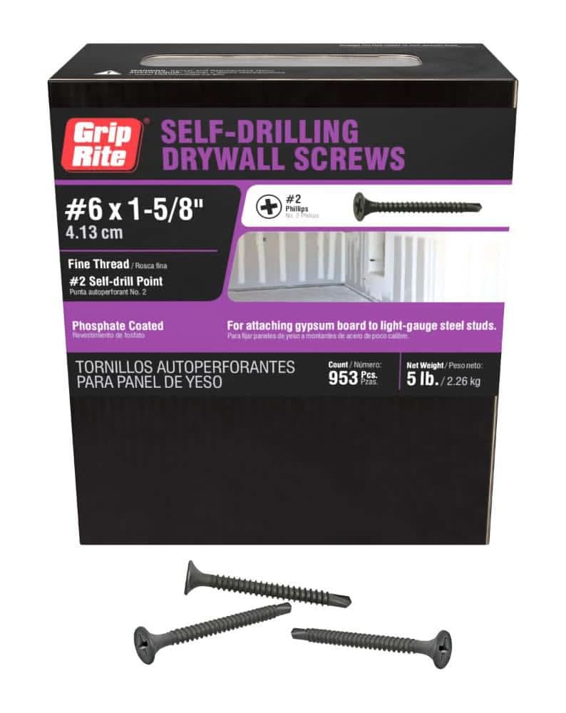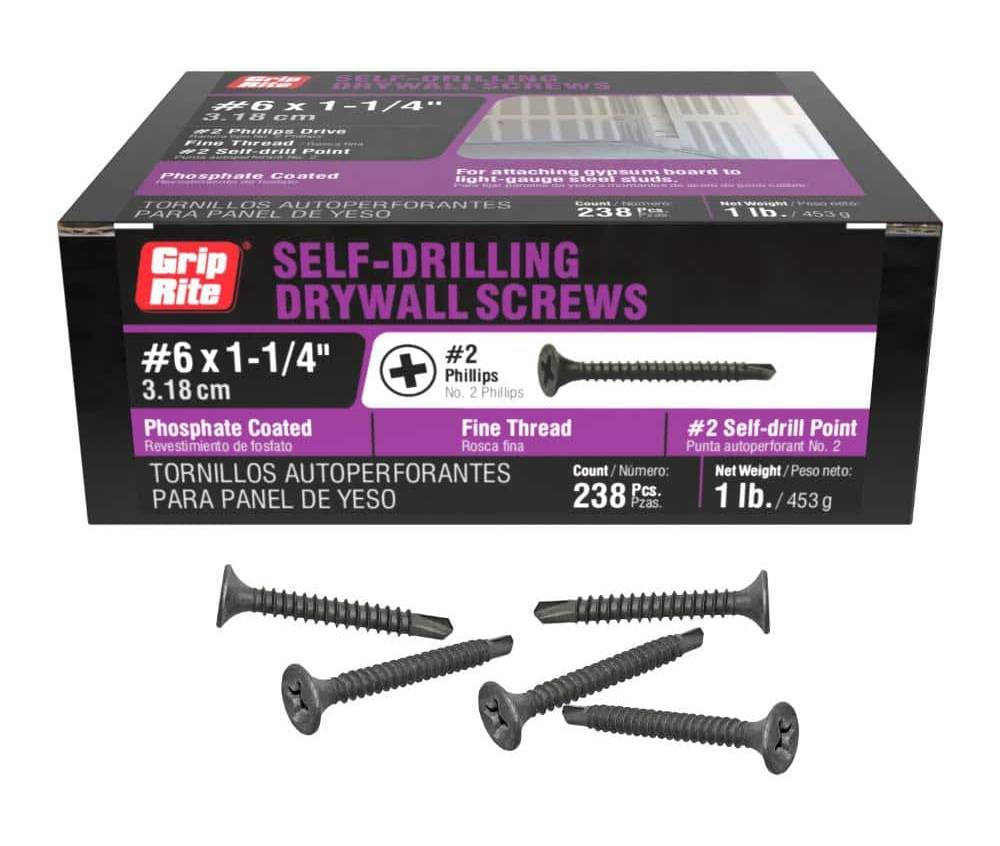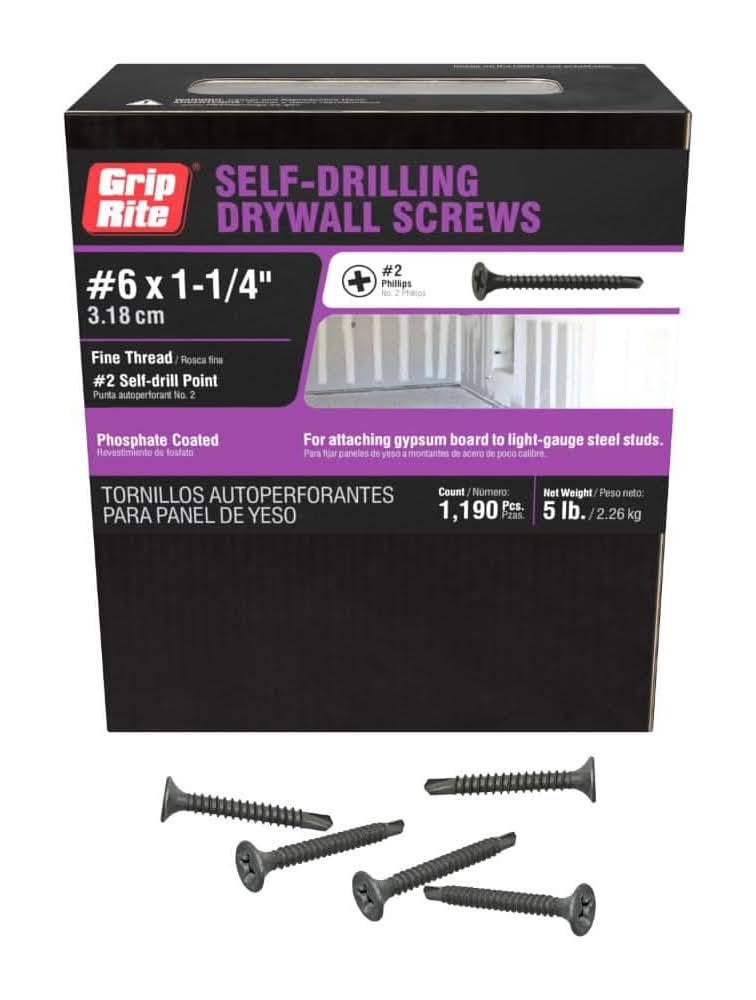 Grip-Rite Phillips No 2 Bugle Head Fine Thread Self-Drilling Dry Wall Screws, 6x1 1/4 in (5 lbs, 1190 ct)