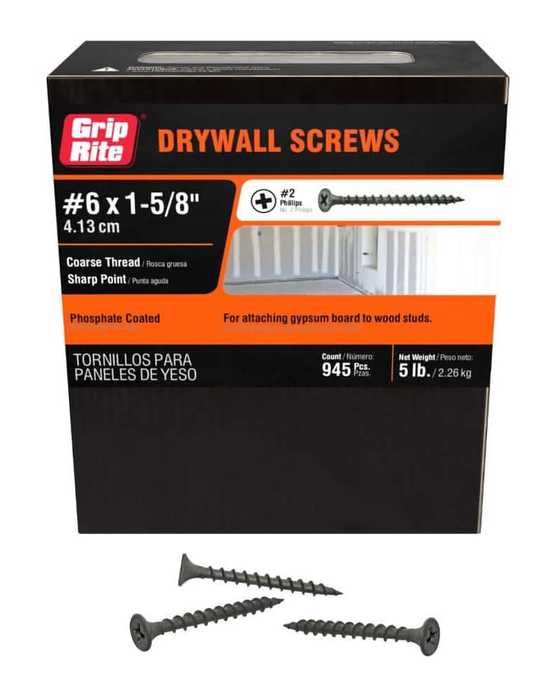 Grip-Rite Coarse Thread Drywall Screws, 6 x 1-5/8 in (5 lbs, 995 ct)