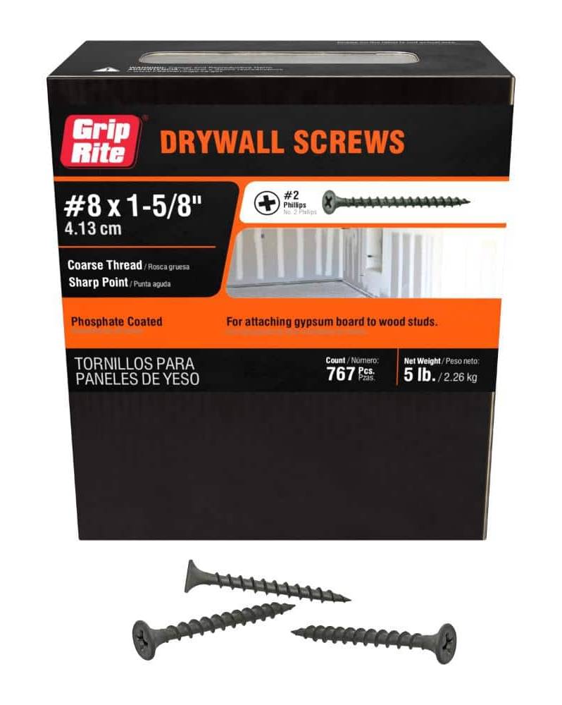 Grip-Rite Coarse Thread Drywall Screws, 8 X 1-5/8 In (5 lbs, 767 ct)