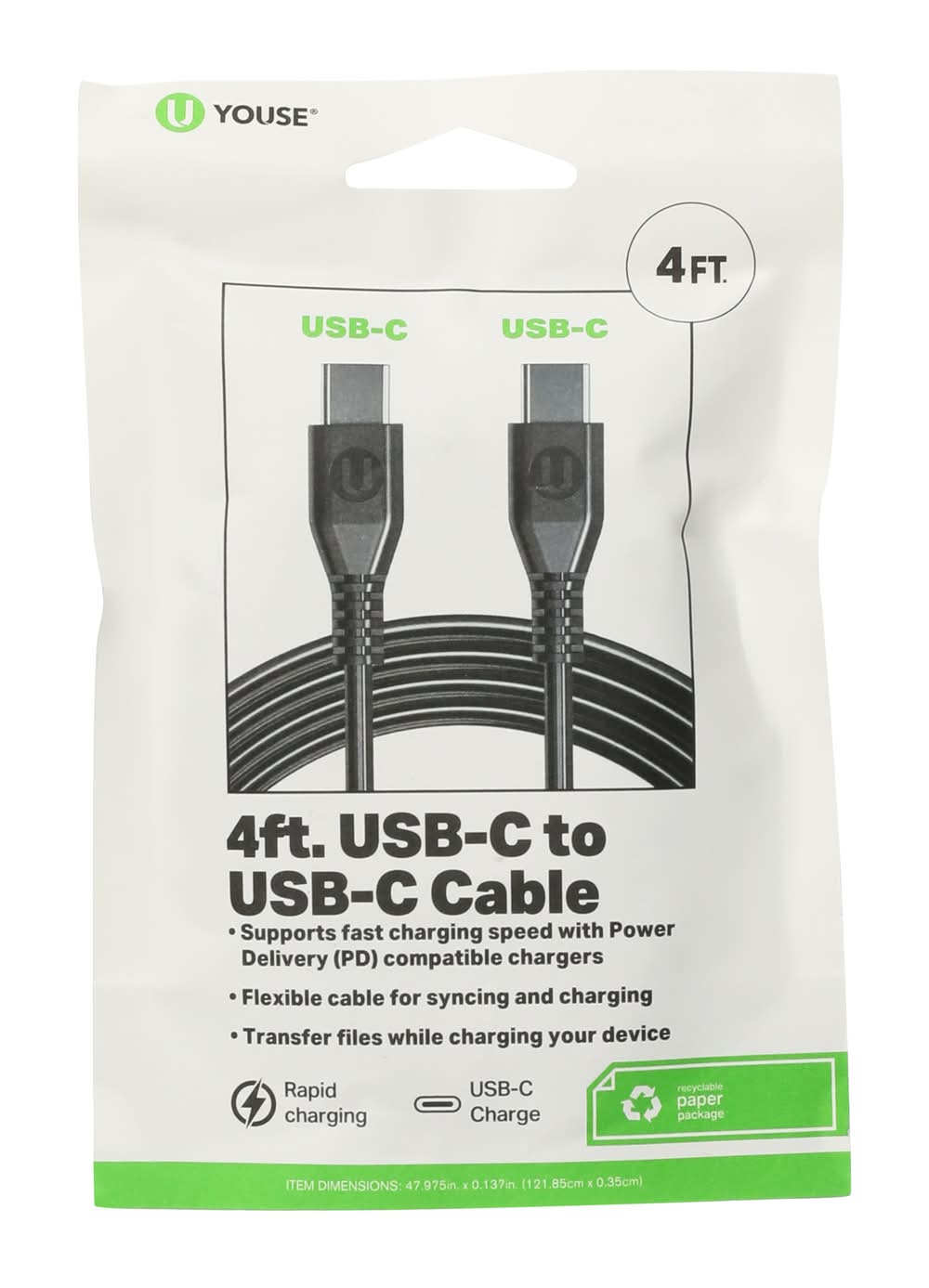 U YOUSE Usb-C To C Cable, 4 ft, Black