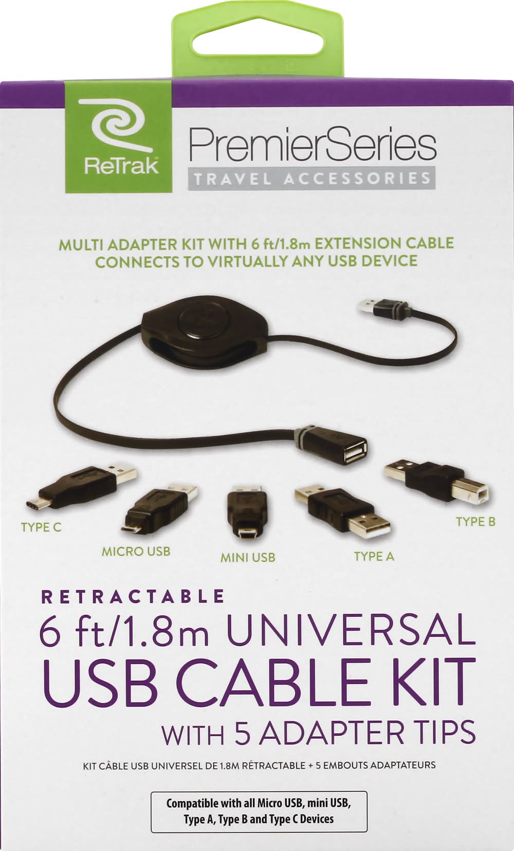 ReTrak Retractable Universal Usb Cable Kit, 6 Feet
