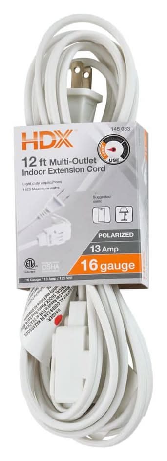 HDX Light Duty Indoor Multi-Outlet Extension Cord, 12 ft, White