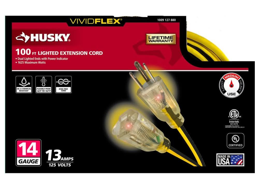 Husky Vividflex 14/3 Gauge Duty Indoor/Outdoor Lighted Extension Cord, M- 100 ft, Yellow