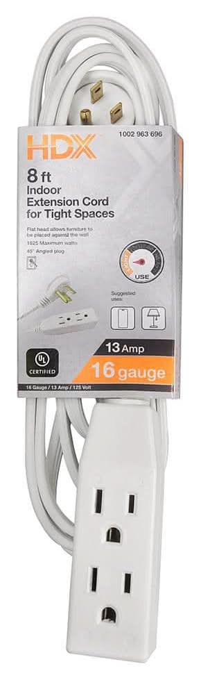HDX Indoor Tight Spaces Extension Cord, 8 ft, White