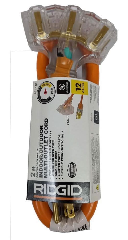 RIDGID Heavy Duty Indoor Outdoor Extension Cord With Triple Tap Lighted, 2 ft, Orange-Grey (12 ct)