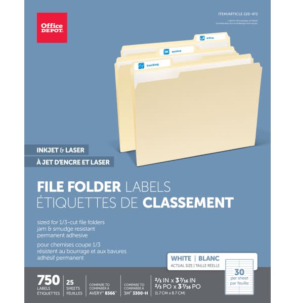 Office Depot Permanent File Folder Labels, 2/3x3-7/16 in, White (750 ct)