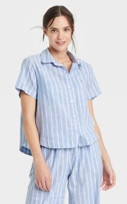 Auden Striped Cotton Blend Short Sleeve Pajama Shirt, Women, S, Light Blue