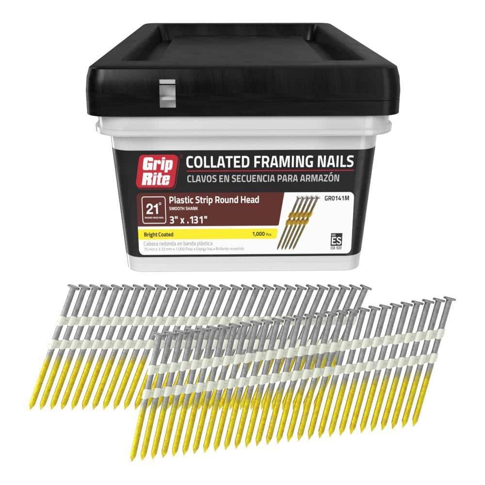 Grip-Rite Plastic Collated Bright Coated Smooth Shank Round Head Framing Nails, 3-1/4 In. X 0.131 In. (1000 ct)