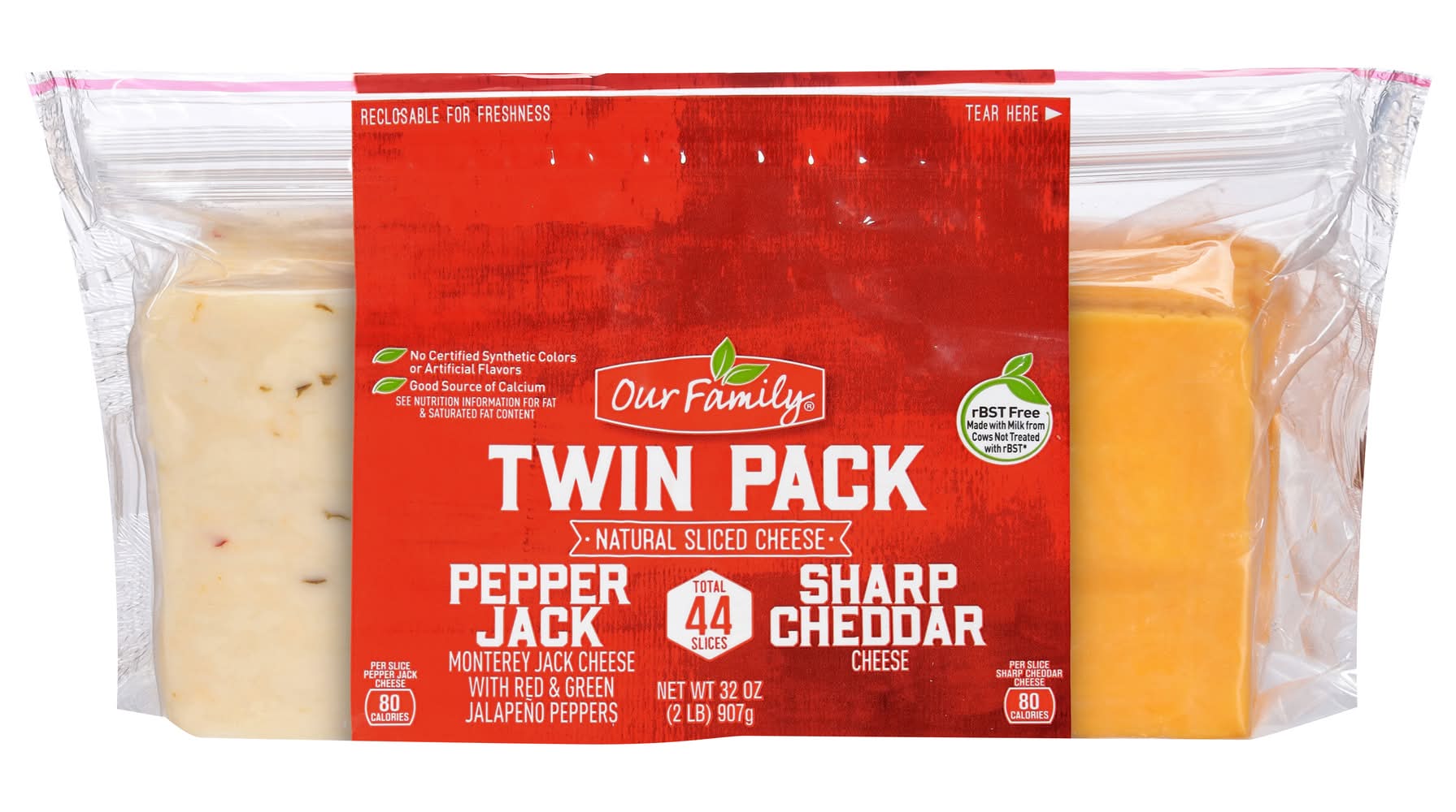 Our Family Natural Sliced Cheese Twin pack, Pepper Jack-Sharp Cheddar (32 oz, 44 ct)