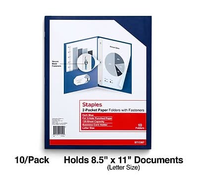 Staples 2-Pocket Paper Presentation Folder With Fasteners, Dark Blue (10 ct)