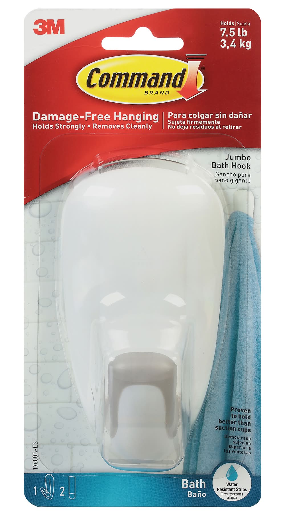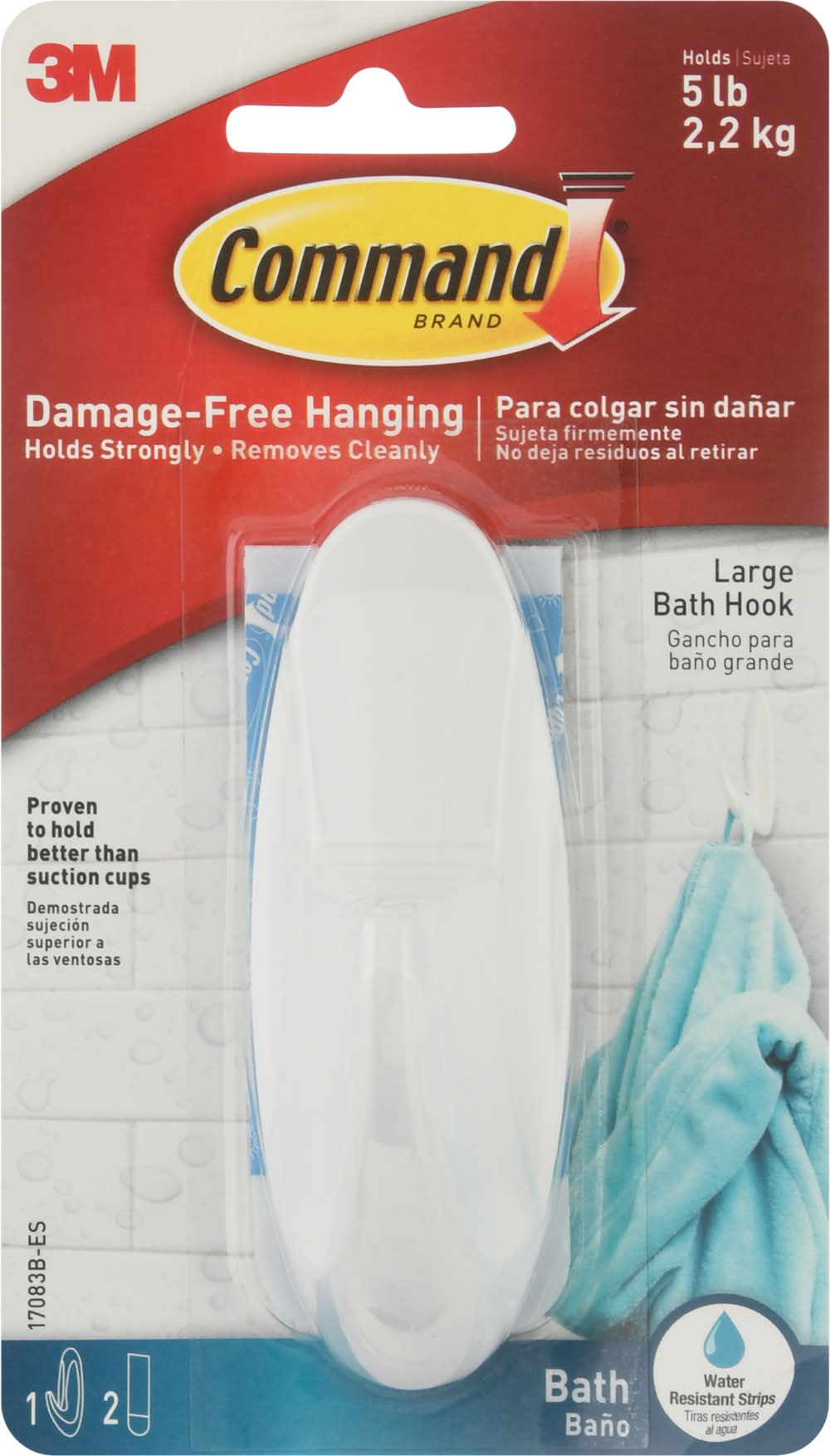 Command Bath Hook, White, Large, 1 Hook, 2 Strips/Pack