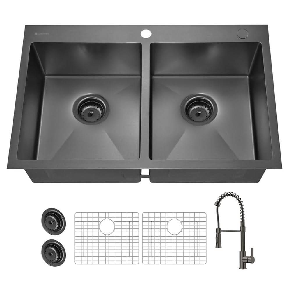 Glacier Bay 33 In. Drop-In Double Bowl Gunmetal Black Stainless Steel Kitchen Sink With Spring Neck Faucet
