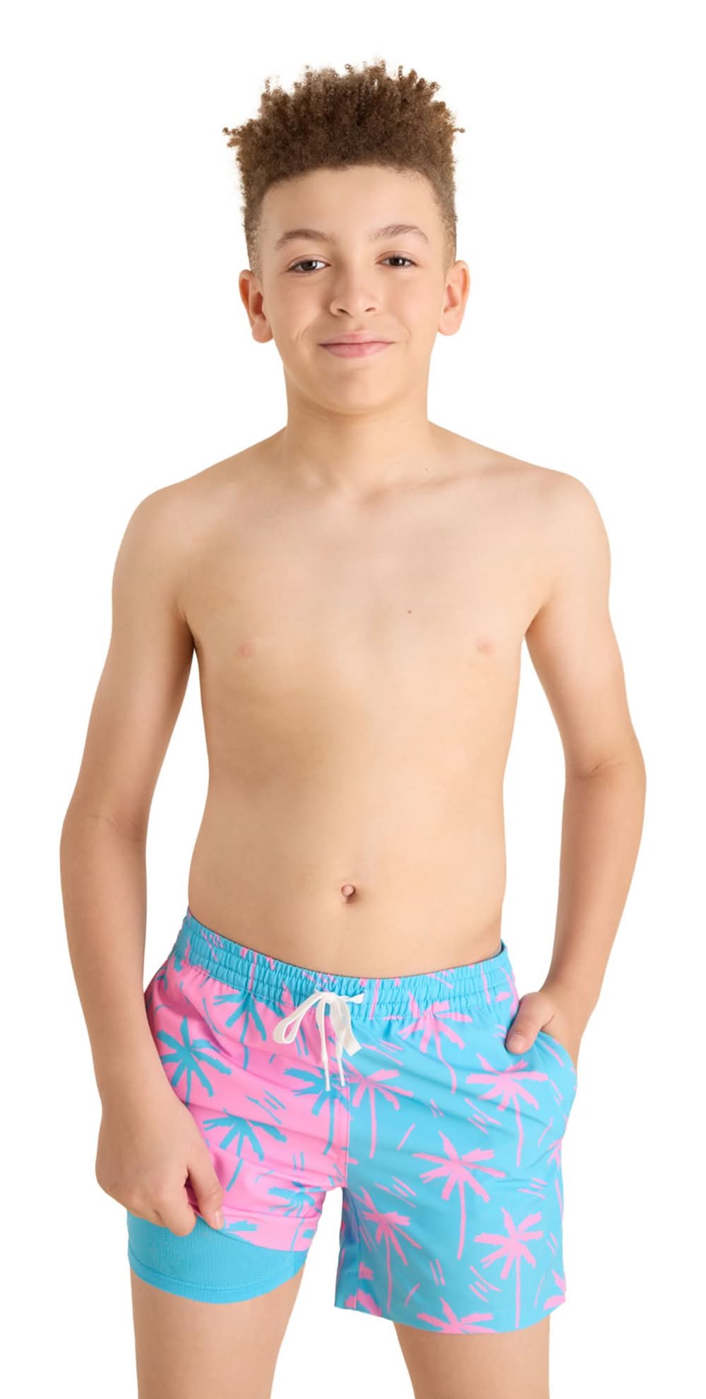 Chubbies Prince Of Prints Boys' Shorter Classic Lined Swim Trunks, M, Blue & Pink Palms/Light Blue Liner