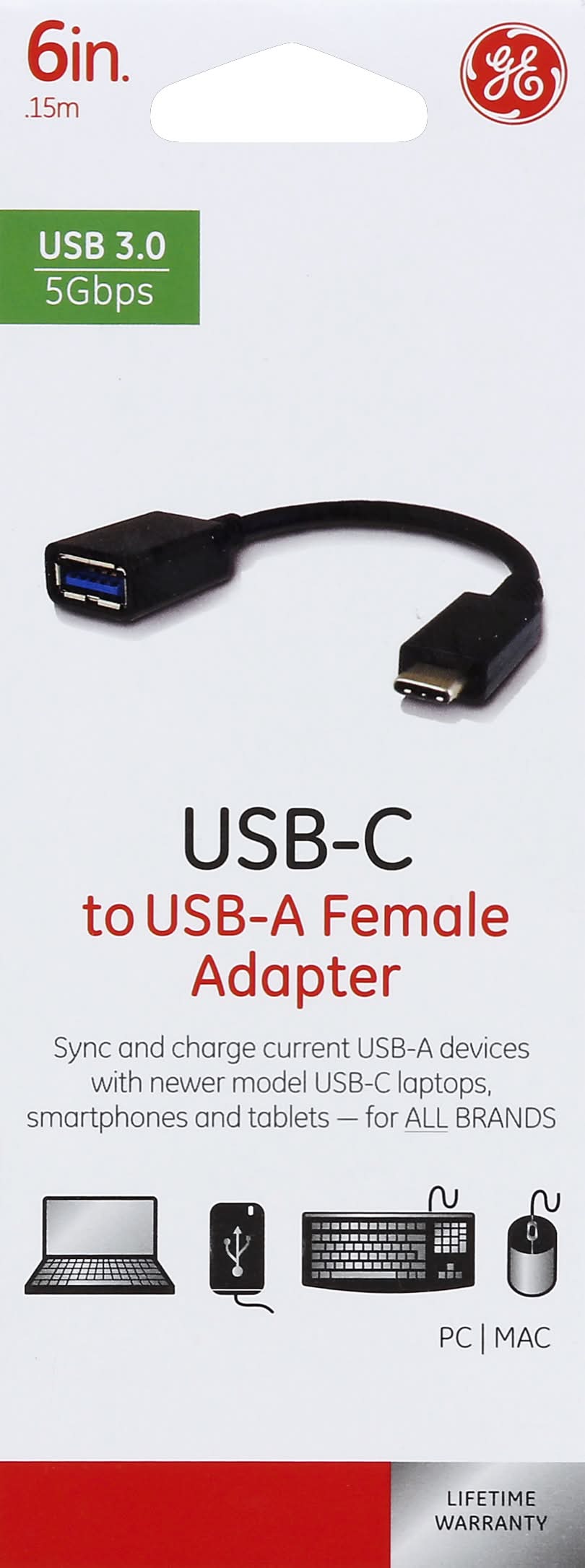 General Electric Usb-C To Usb-A Female Adapter, 6 Inches