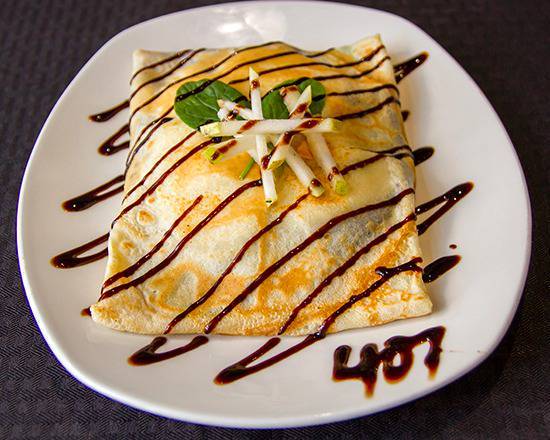 Grilled chicken breast or steak, pears, spinach, and swiss cheese with a balsamic reduction.