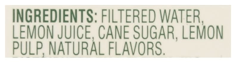 Ingredients: Filtered Water, Lemon Juice, Cane Sugar, Lemon Pulp, Natural Flavors