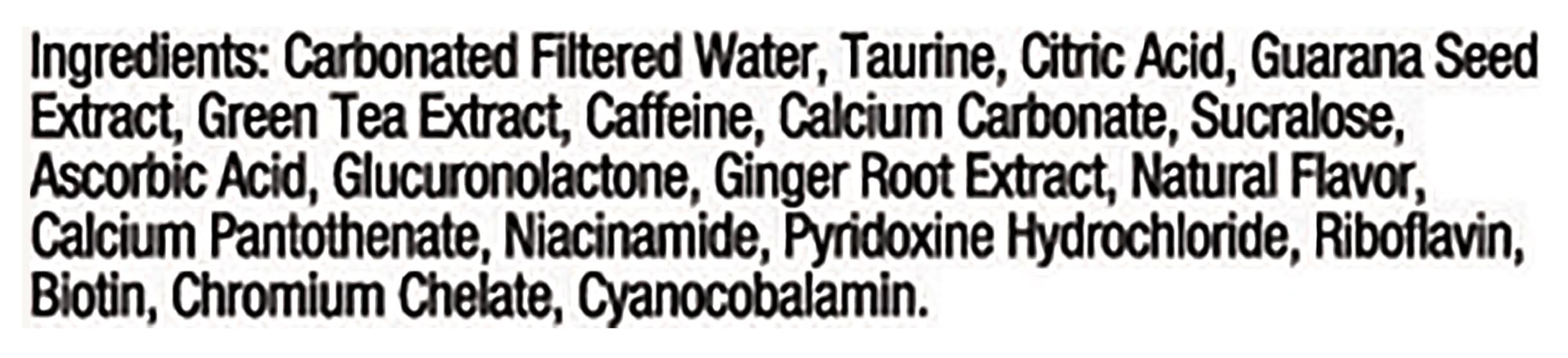 Ingredients: Carbonated Filtered Water, Taurine, Citric Acid, Guarana Seed Extract, Green Tea Extract, Caffeine, Calcium Carbonate, Sucralose, Ascorbic Acid, Glucuronolactone, Ginger Root Extract, Natural Flavor, Calcium Pantothenate, Niacinamide, Pyridoxine Hydrochloride, Riboflavin, Biotin, Chromium Chelate, Cyanocobalamin