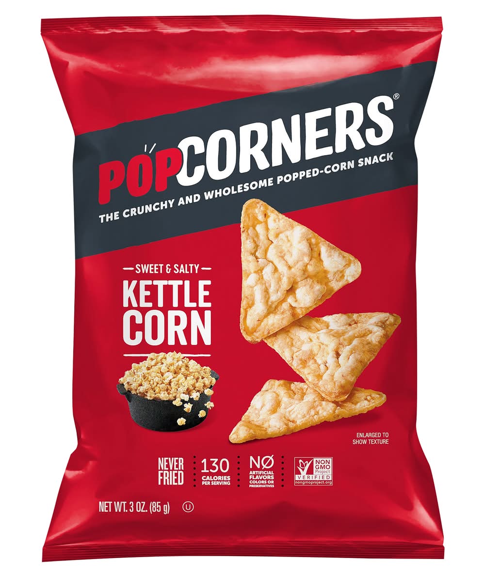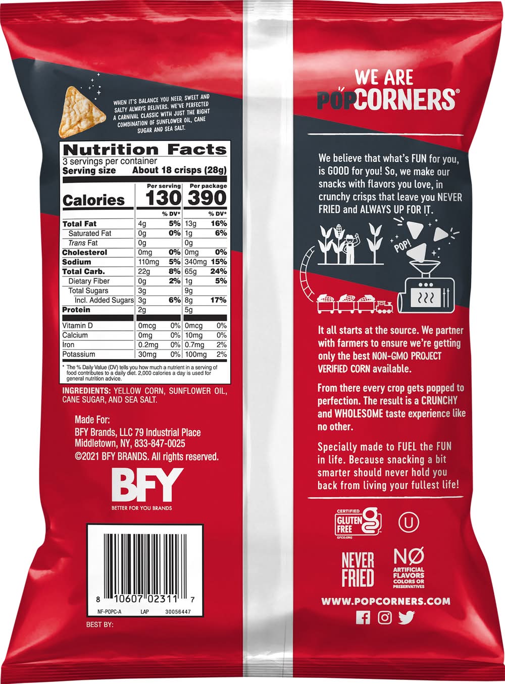 Each Serving Contains 130 Calories And Is Crafted Without Artificial Flavors, Colors, Or Preservatives. Made With Sunflower Oil, Cane Sugar, And Sea Salt, These Chips Are Popped, Not Fried, Providing A Lighter Alternative. They Are Certified As Gluten-Free And Boast The Non-Gmo Project Verification, Ensuring That The Corn Used Is Of The Highest Quality And Non-Genetically Modified. • Brand: Popcorners • Flavor: Sweet & salty • kosher, gluten-free