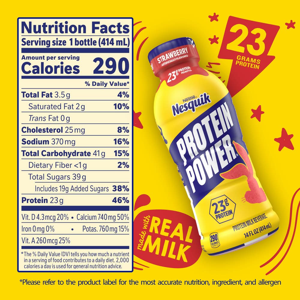 Start your day off right with Protein Power Milk. Get twenty-three grams of protein without compromising taste. Just chill this shelf-stable milk in the fridge, then shake for a sweet and nostalgic protein drink. It’s the perfect protein milk beverage. Any way or anywhere you sweeten up your day, you can feel good about sipping this great tasting protein drink, with 64% more protein than regular. This ready-to-drink protein milk beverage is made with one hundred percent real milk. • Brand: Nesquik • Flavor: Strawberry • kosher • Packaging: Reusable