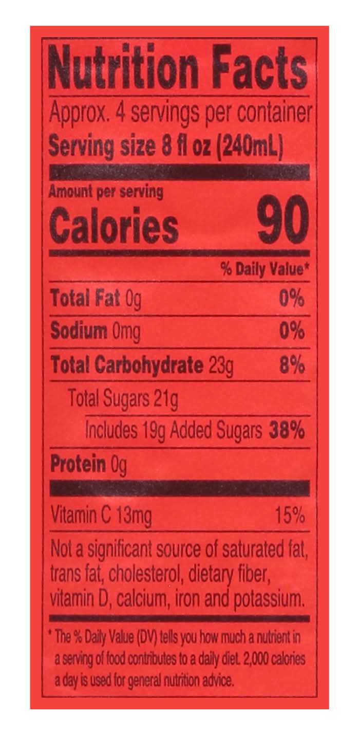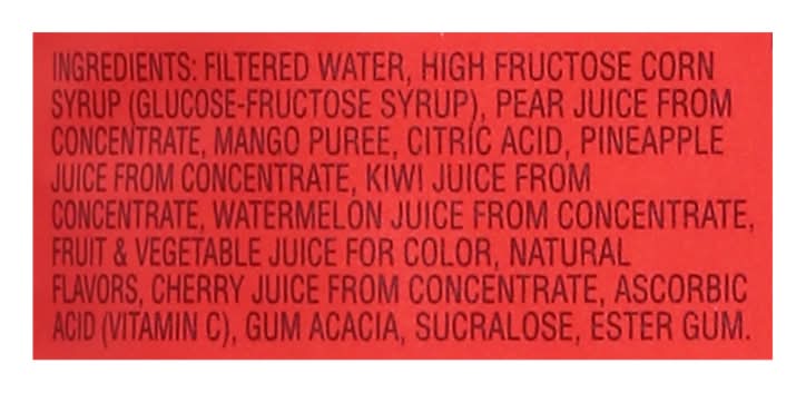 Ingredients: Filtered Water, High Fructose Corn Syrup (Glucose-Fructose Syrup), Pear Juice from Concentrate, Mango Puree, Citric Acid, Pineapple Juice from Concentrate, Kiwi Juice from Concentrate, Watermelon Juice from Concentrate, Fruit & Vegetable Juice for Color, Natural Flavors, Cherry Juice from Concentrate, Ascorbic Acid (Vitamin C), Gum Acacia, Sucralose, Ester Gum Contains: Corn