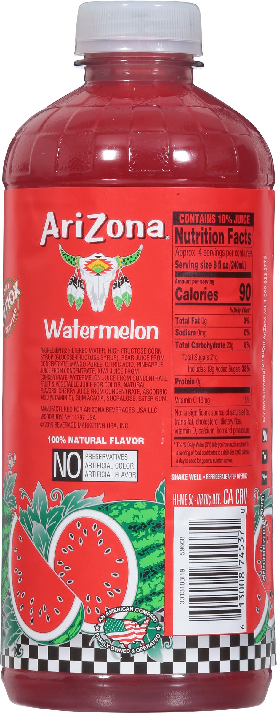 All natural flavor. 100% natural flavor. No artificial flavor. Antiox: Vitamin C fortified. No artificial preservatives. No artificial colors. An American company family owned & operated. • Brand: Arizona • Flavor: Watermelon • kosher • Number of servings: 4 • Arizona Beverages USA LLC, Woodbury, NY, 11797