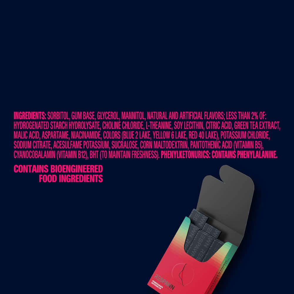 Ingredients: SORBITOL, GUM BASE, GLYCEROL, NATURAL AND ARTIFICIAL FLAVORS; LESS THAN 2% OF: HYDROGENATED STARCH HYDROLYSATE, CHOLINE CHLORIDE, L-THEANINE, SOY LECITHIN, CITRIC ACID, GREEN TEA EXTRACT, MALIC ACID, MANNITOL, ASPARTAME, COLOR (BLUE 2 LAKE, YELLOW 6 LAKE, RED 40 LAKE), NIACINAMIDE, POTASSIUM CHLORIDE, SODIUM CITRATE, ACESULFAME K, SUCRALOSE, CORN MALTODEXTRIN, VITAMIN B12 (CYANOCOBALAMIN), VITAMIN B5 (PANTOTHENIC ACID), VITAMIN B6 (PYRIDOXINE HYDROCHLORIDE), BHT (TO MAINTAIN FRESHNESS).