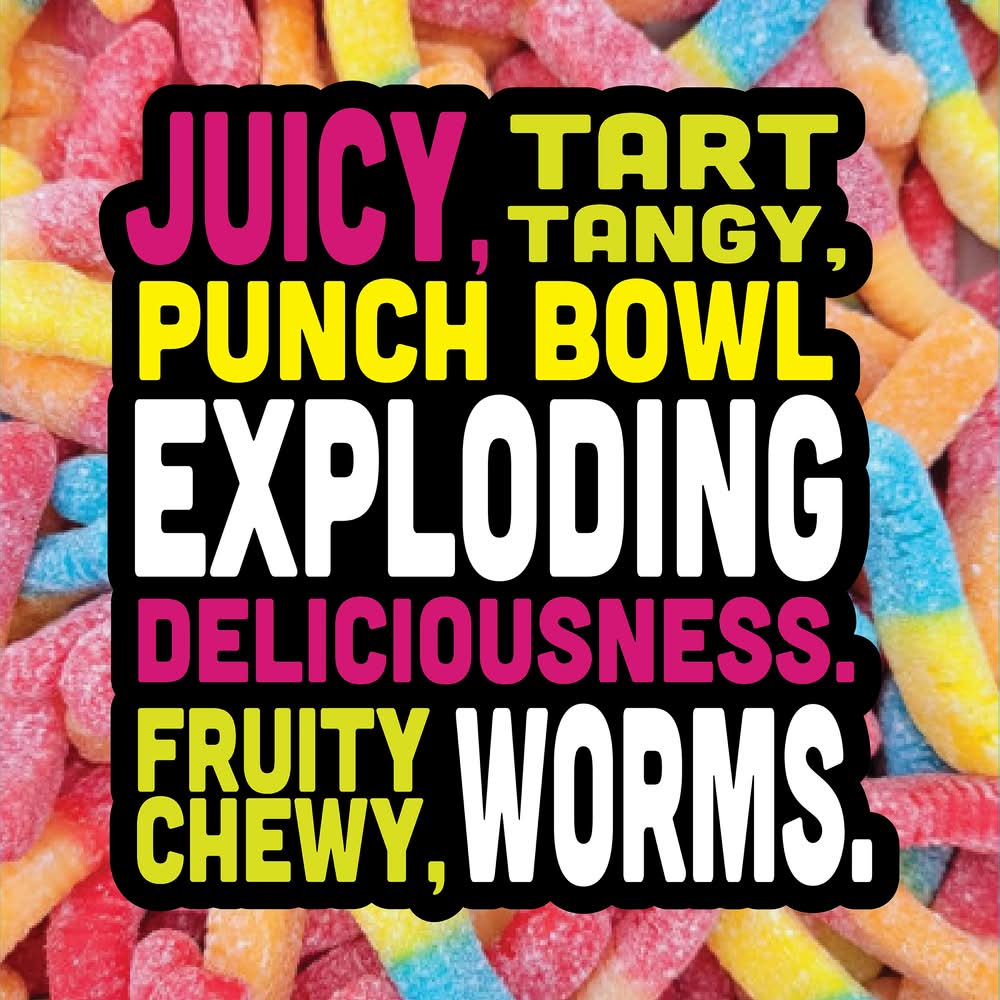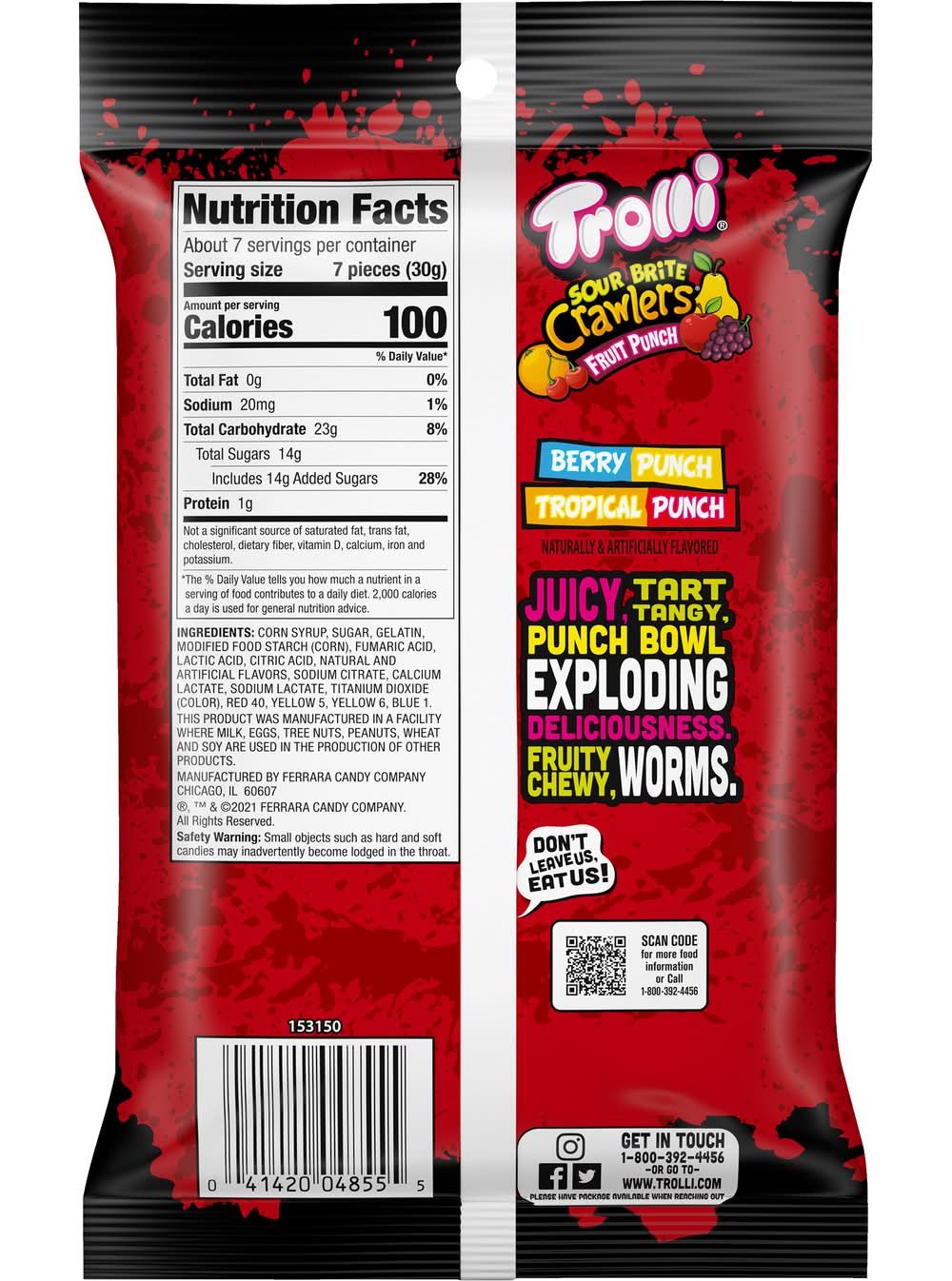 Trolli Fruit Punch Sour Brite Crawlers are covered in tangy, sweet goodness and dusted with the perfect amount of sour sugar. Trolli Sour Brite Crawlers Fruit Punch are a fruity twist on the original gummy worms, in two tongue teasing flavor combinations. • Brand: Trolli • Flavor: Fruit punch