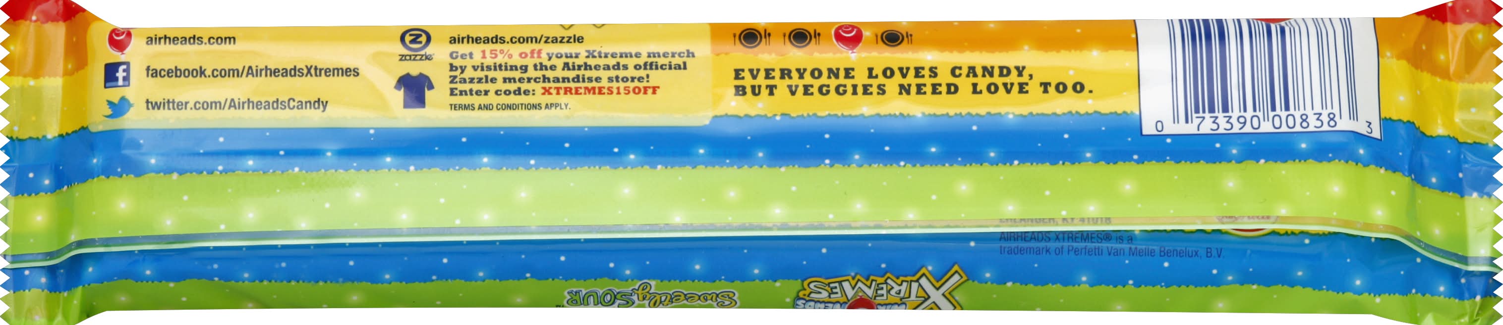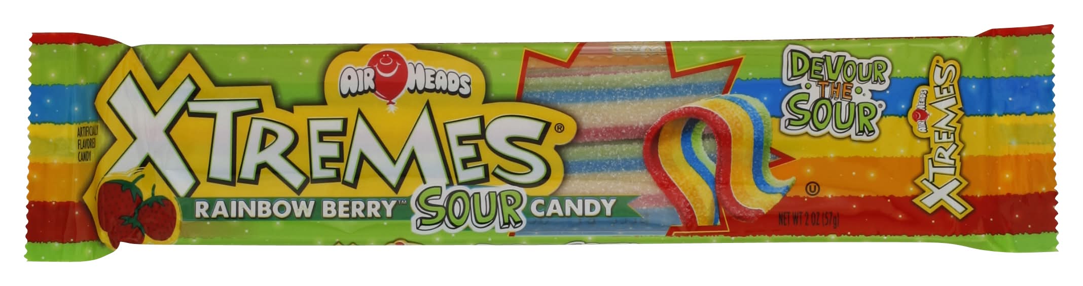 Artificially flavored candy. Devour the sour. Everyone loves candy, but veggies need love too. • Brand: Airheads xtremes • Flavor: Rainbow berry • kosher