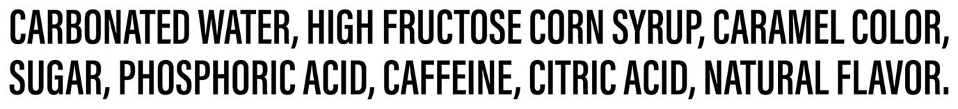 Ingredients: Carbonated Water, High Fructose Corn Syrup, Caramel Color, Sugar, Phosphoric Acid, Caffeine, Citric Acid, Natural Flavor Contains: Corn