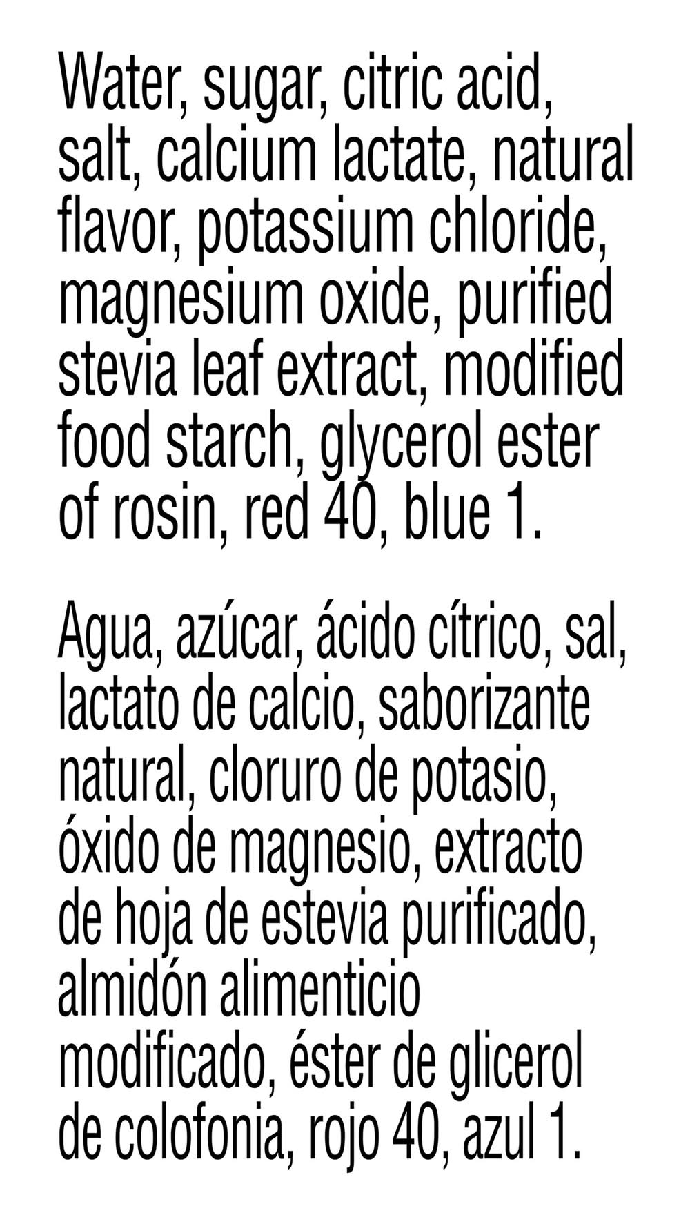 Ingredients: Water, Sugar, Citric Acid, Salt, Calcium Lactate, Natural Flavor, Potassium Chloride, Magnesium Oxide, Purified Stevia Leaf Extract, Modified Food Starch, Glycerol Ester of Rosin, Red 40, Blue 1