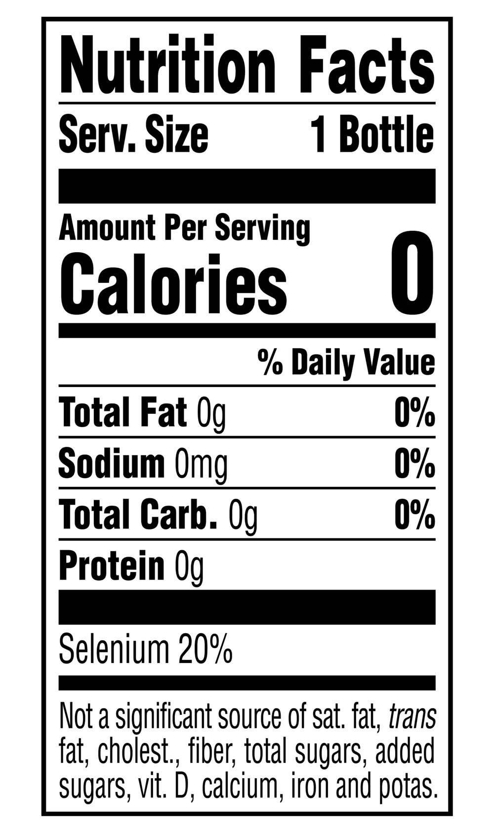Ingredients: Vapor Distilled Water, Calcium Chloride And Magnesium Chloride And Potassium Bicarbonate (Electrolyte Sources), Sodium Selenate. Electrolytes Added For Taste