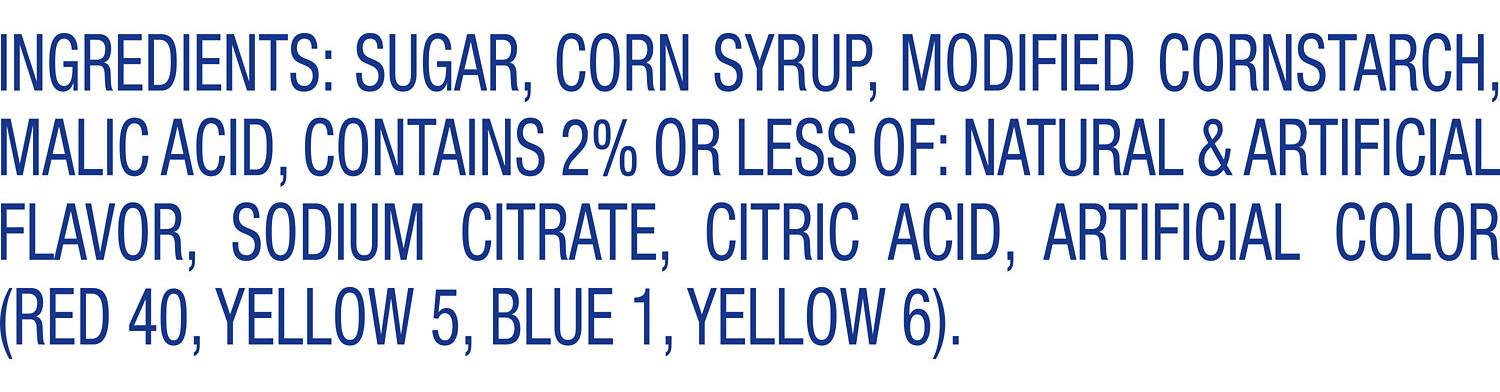 Ingredients: Sugar, Corn Syrup, Modified Cornstarch, Malic Acid, Contains 2% or Less of: Natural & Artificial Flavor, Sodium Citrate, Citric Acid, Artificial Color (Red 40 Yellow 5 Blue 1 Yellow 6) Contains: Corn