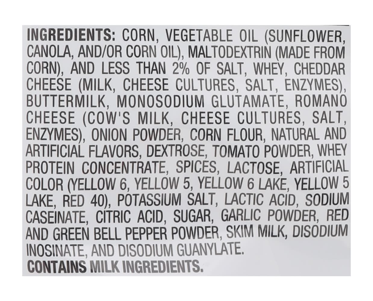 Ingredients: Corn, Vegetable Oil (Sunflower, Canola, and/or Corn Oil), Maltodextrin (Made from Corn), and Less than 2% of Salt, Whey, Cheddar Cheese (Milk, Cheese Cultures, Salt, Enzymes), Buttermilk, Monosodium Glutamate, Romano Cheese (Cow's Milk, Cheese Cultures, Salt, Enzymes), Onion Powder, Corn Flour, Natural and Artificial Flavors, Dextrose, Tomato Powder, Whey Protein Concentrate, Spices, Lactose, Artificial Color (Yellow 6, Yellow 5, Yellow 6 Lake, Yellow 5 Lake, Red 40), Potassium Salt, Lactic Acid, Sodium Caseinate, Citric Acid, Sugar, Garlic Powder, Red and Green Bell Pepper Powder, Skim Milk, Disodium Inosinate, and Disodium Guanylate Contains: Milk, Corn, Lactose