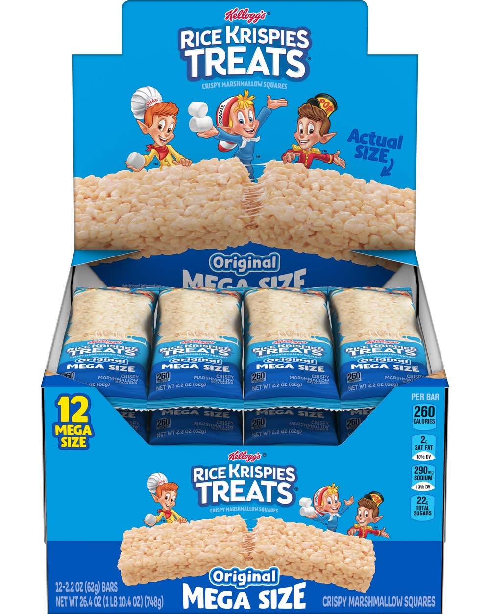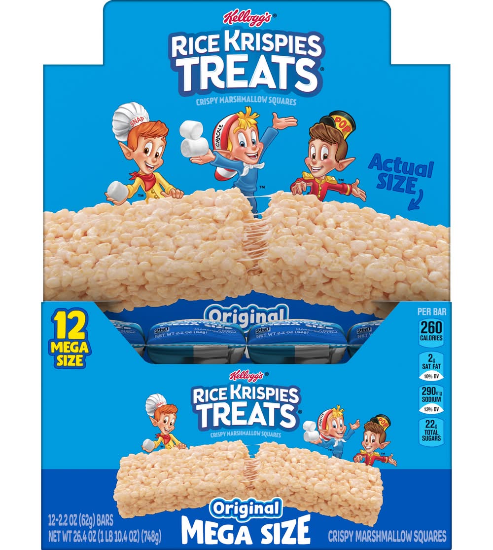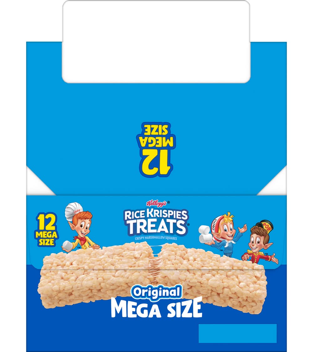 Enjoy the fun of everyday moments with the irresistible taste of Rice Krispies Treats Crispy Marshmallow Mega Bars Large Snack Bars. Every bar starts with oven-toasted puffed rice cereal and the taste of chewy, gooey marshmallows. A classically delicious snack, these individually wrapped marshmallow bars are 1.5 times larger than our Original bars (62g Bar, 182% bigger than our 22g Bar) perfect for enjoying together with friends and family; Each package contains one marshmallow-flavored bar that's perfect for snacking at school, the office, lunchtime, at the game, and more. Rice Krispies Treats Mega Bars make great additions to goodie bags, gift baskets, or as a surprise in a care package. Satisfy your sweet craving with the marshmallowy goodness and on-the-go convenience of Rice Krispies Treats Mega Bars Large Marshmallow Snack Bars. • Brand: Rice krispies treats • Number of servings: 12 • Kellogg Sales Co., Battle Creek, MI, 49016 • Packaging: Reusable