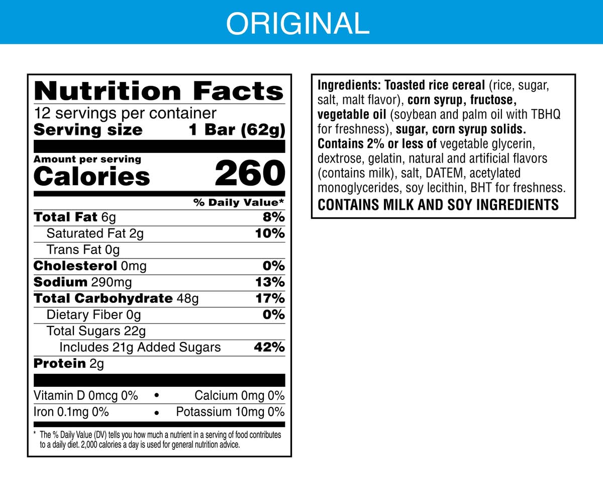 Ingredients: Toasted Rice Cereal (Rice, Sugar, Salt, Malt Flavor), Corn Syrup, Fructose, Vegetable Oil (Soybean And Palm Oil With Tbhq For Freshness), Sugar, Corn Syrup Solids. Contains 2% Or Less Of Vegetable Glycerin, Dextrose, Gelatin, Natural And Artificial Flavors (Contains Milk), Salt, Datem, Acetylated Monoglycerides, Soy Lecithin, Bht For Freshness. Contains: Contains milk and soy ingredients