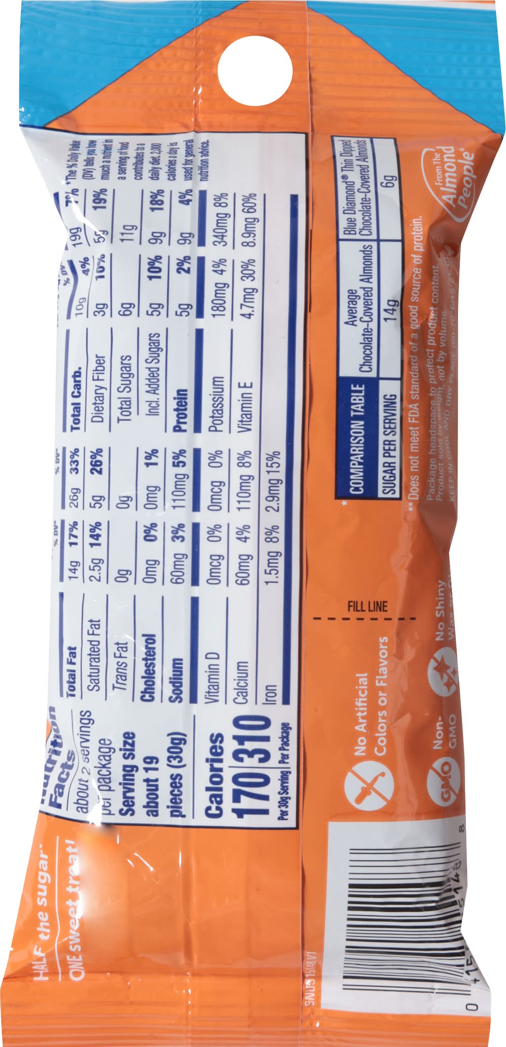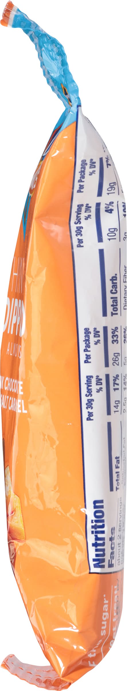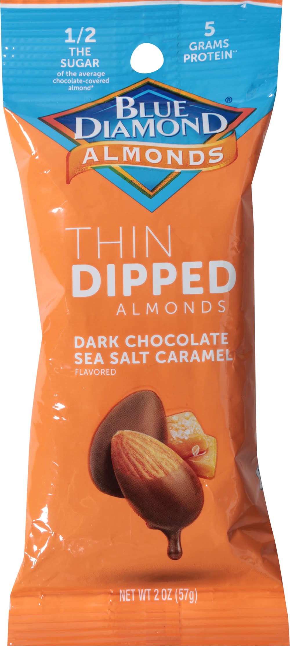 Thin Dipped Dark Chocolate Sea Salt Caramel Flavored Almonds • Brand: Black diamond • Flavor: Dark chocolate sea salt caramel • GMO-free